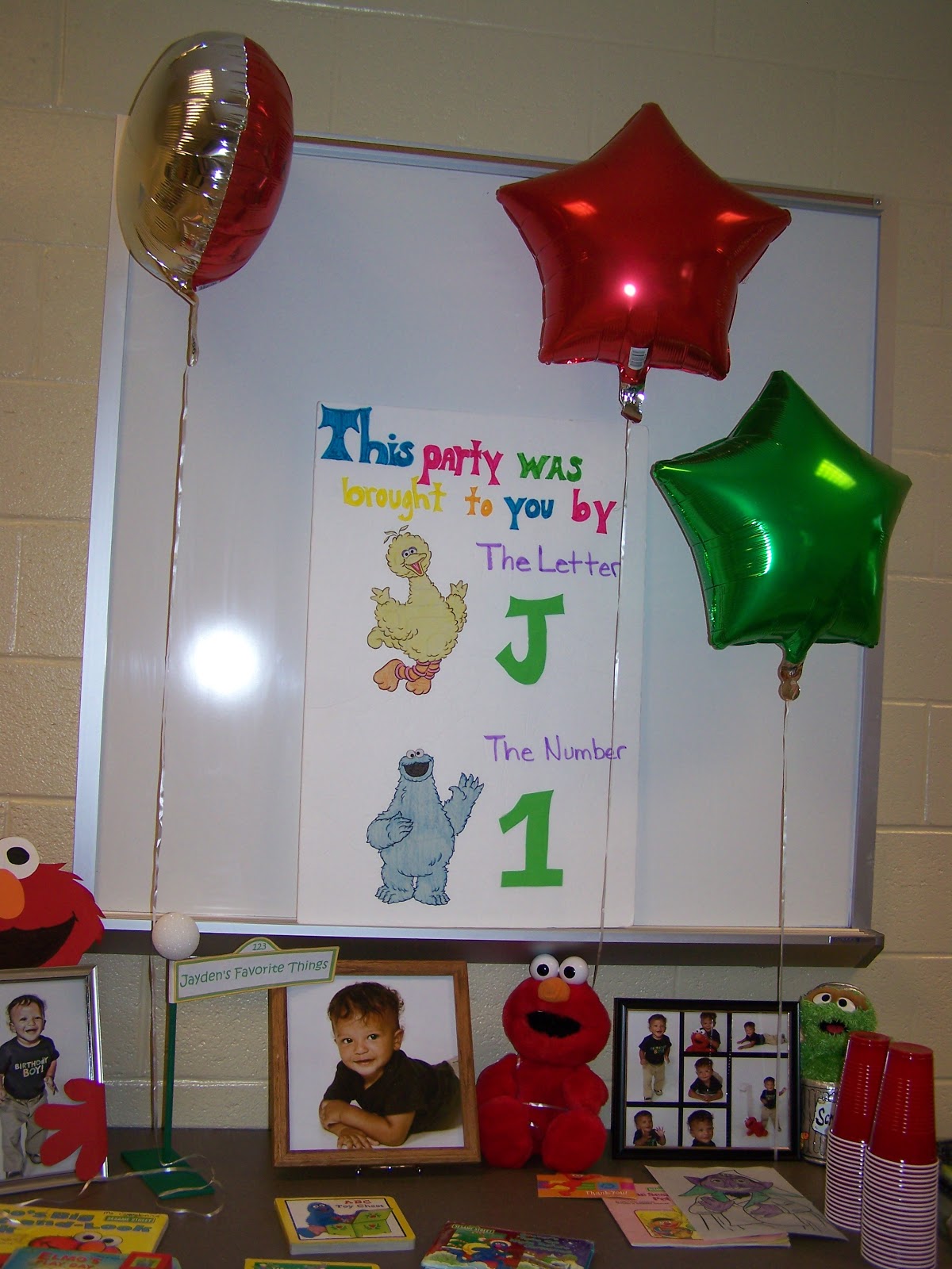 Now it was time to think about decorations. I thought about the main colors for Sesame Street (red, yellow, blue, and green). I wanted to have a area to display Jayden's photos and favorite things. I made the poster board below for under $4!