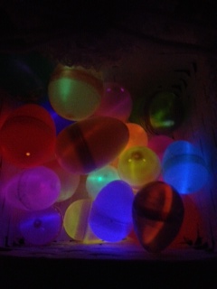 After our traditional egg hunt, my husband and I decided to take a walk on the dark side. A GLOW IN THE DARK EGG HUNT! We have always wanted to do a GID egg hunt but our kids have been to little. It was really simple. For starters it has to be night time. For MUCH older children (middle school aged and older), maybe you could even venture outside. All you need is preferably large plastic eggs in lighter colors, such as white and yellow. Some darker colors may work fine as well. I used the glow stick bracelets from the Dollar Tree. Find them on the toy isle. You get 5 in one pack. These are the non-reusable ones. You break them to release the chemicals If you can find the ones you sit in daylight to charge, you can use those another year. Also you could try other small objects that glow in the dark and see if those will work for you. I ended up use a mix of large and small eggs. I had to use tape for the small ones though. But nevertheless, our GID egg hunt was a success!
